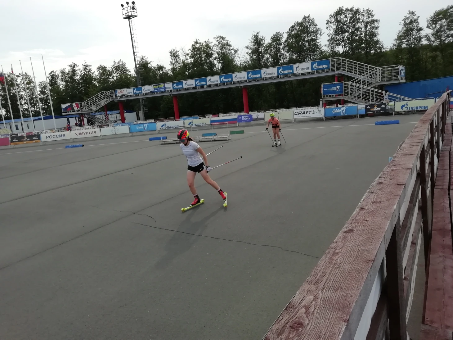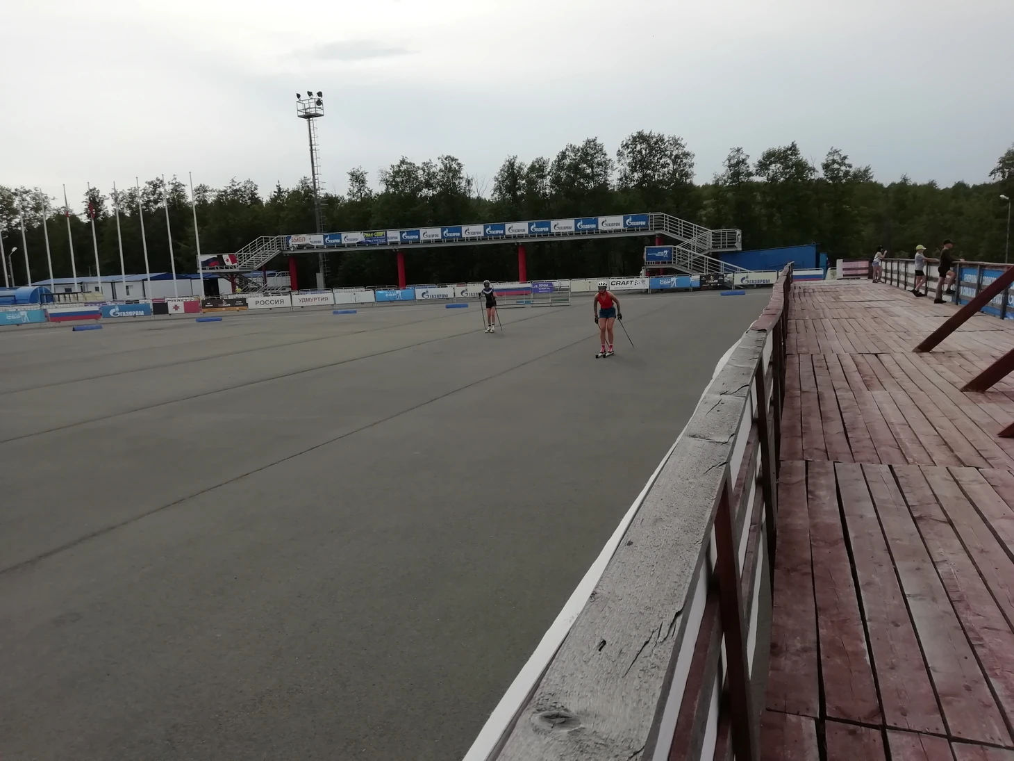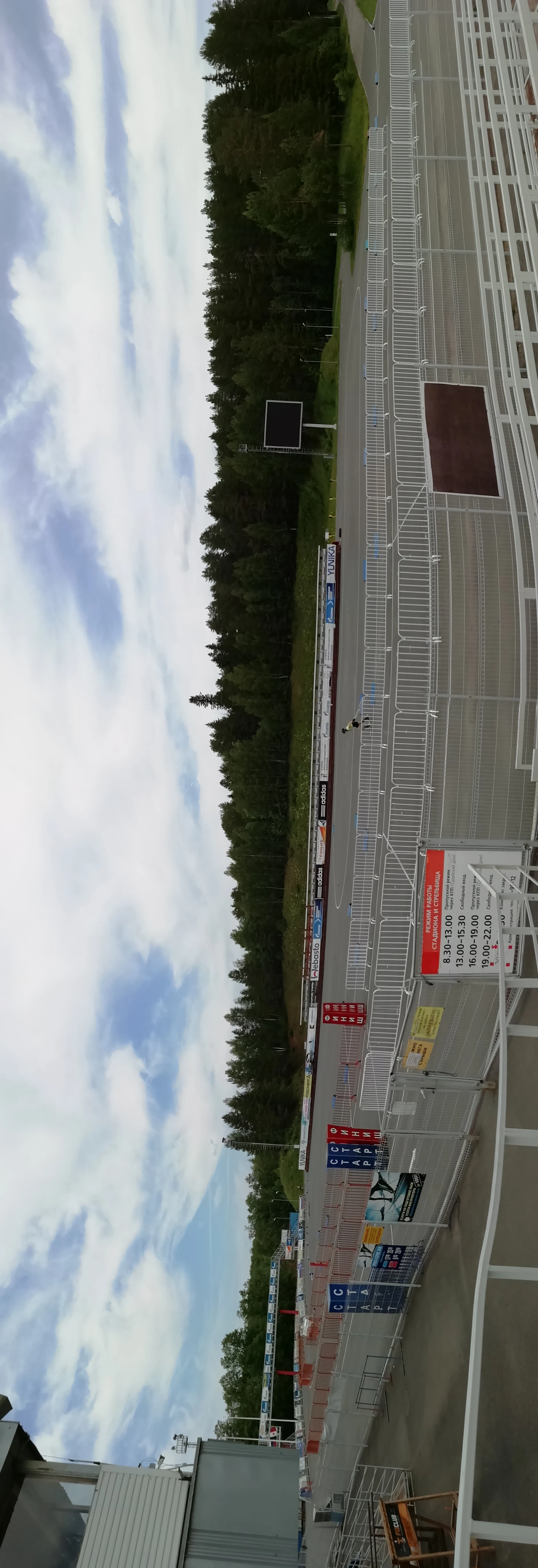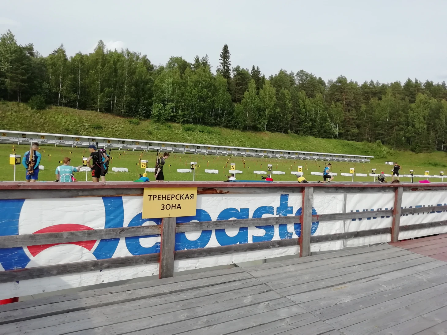 Столица Удмуртии встретила солнечной и жаркой, под 30 градусов, погодой, дополненной теплым или даже слегка горячим ветром. Обустроившись в той же гостинице, что и сборная, под названием «Сосновый бор», я двинул на биатлонный стадион, с которого доносились звуки выстрелов и закрывающихся (или незакрывающихся) мишеней. Проход на территорию был запрещен в связи с тренировкой, поэтому, забрался на трибуну, которая расположена достаточно далеко от стрельбища. Кроме того, самих спортсменок, при стрельбе лежа, от нее закрывала тренерская биржа.
