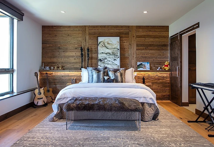 Вот мы добрались и до спальни. Посреди комнаты стоит огромная, как талант Мики, кровать, на которой можно и понежиться. В углу две гитары. Мика ещё и на гитаре играет и может даже спеть. Одни любят вязать перед сном – а Мика помузицировать. Звёзды спорта разные, но очень талантливые.