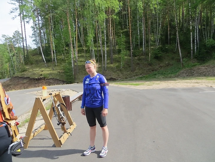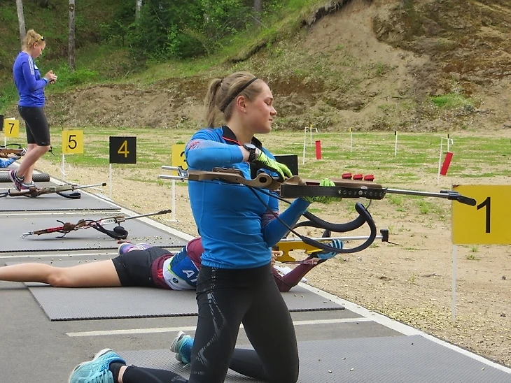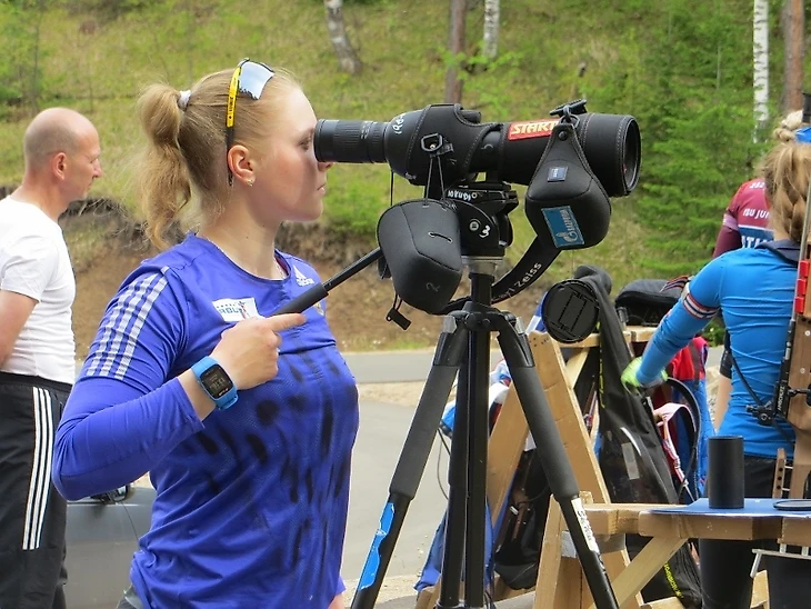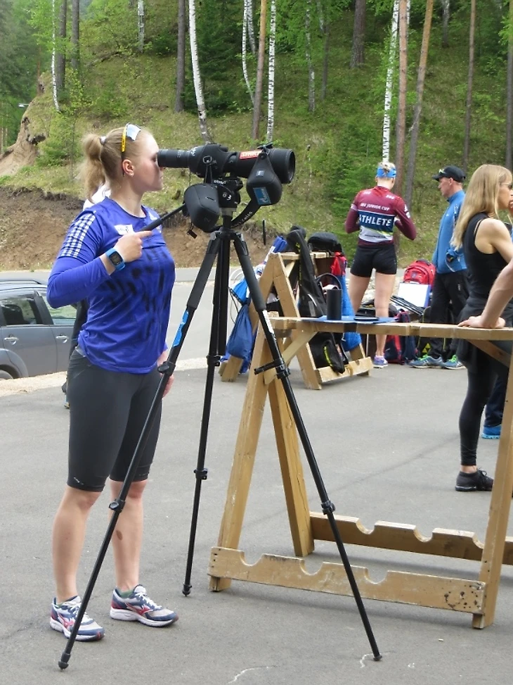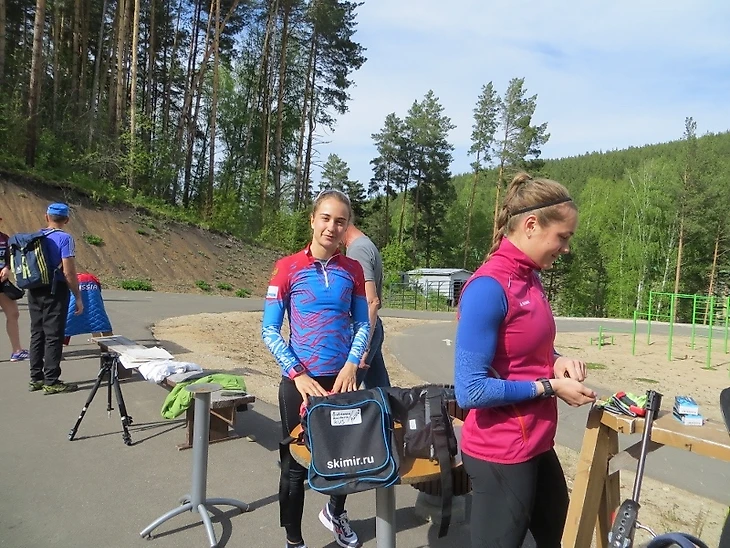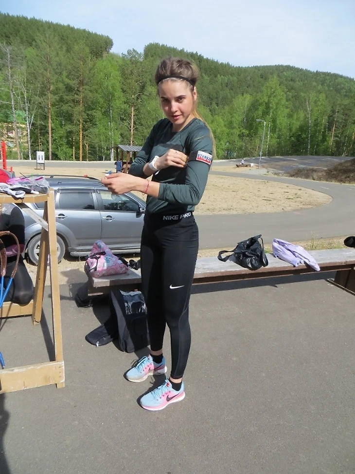 25 мая перед обеденным перерывом я попросила доктора женской сборной Евгения Георгиевича Шутова, чтобы он помог мне информацией о том, где и когда можно будет встретиться с юниорской сборной по биатлону (и с девушками, и с парнями). Он сказал, что уточнит и скажет мне об этом на стрелковой тренировке женской сборной. А там я так "зафотографировалась", что забыла и думать об юниорах. Уже ближе к концу тренировки подошла к Евгению Георгиевичу и напомнила ему о своей просьбе. Он кому-то позвонил и сказал, что мне никуда идти не надо: обе юниорские сборные будут по очереди проводить стрелковые тренировки на этом стрельбище. Радости моей не было предела: никуда не надо было идти с обжитого местечка, что, с учётом ноющего колена, можно было считать большим везением. Когда женская сборная ушла играть в волейбол, я немного отдохнула, посидев на скамейке и созерцая вот эту любимую картинку. Николай Степанович Загурский ещё не покинул рабочее место, а к скамейкам уже подошли девушки со своими вещами и оружием. Анастасия Кайшева, которую я хорошо знала в лицо, немного задержалась о чём-то переговорить с тренером старших, а из тех, кто подошёл, я смогла опознать только одну девушку (не так давно её фото видела на сайте в "Вк"). Это была Ксения Довгая. И то, называя её, я промахнулась с именем: назвала Алиной. Девчата удивились, что я вообще знаю хотя бы кого-то. Я поняла, что они и сами ещё не очень близко знают друг друга, потому что кто-то из них начал уточнять у Ксении, где правильно ставить ударение в фамилии. Ксения ответила, что верно с ударением на первый слог:ДОвгая (я так и назвала). Представилась девчатам, рассказала, что всегда слежу за их выступлениями по сивидате, что таких болельщиков немало. Поэтому их имена/ фамилии мы знаем, а вот в лицо- мало кого. Начали знакомиться.