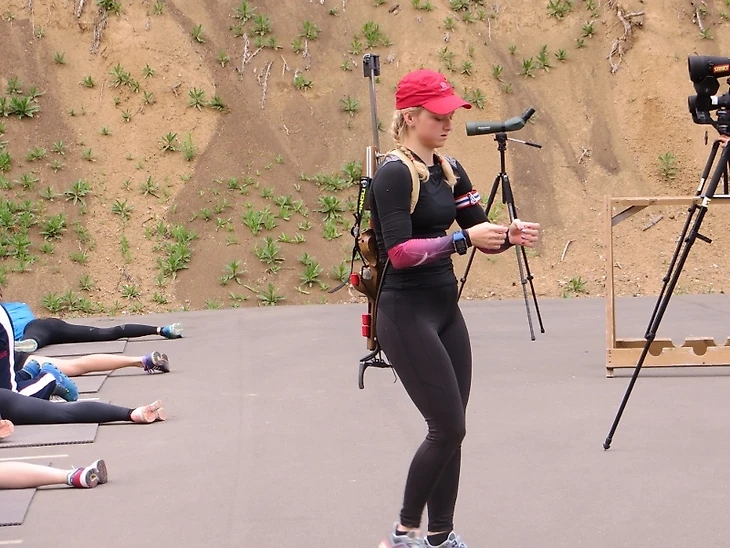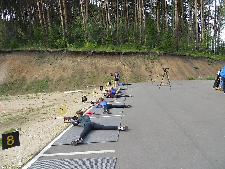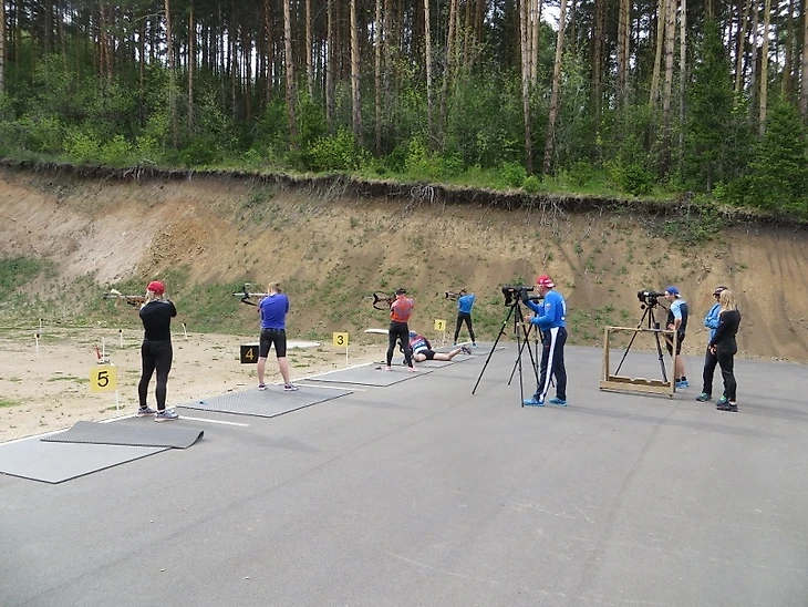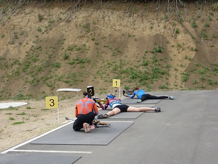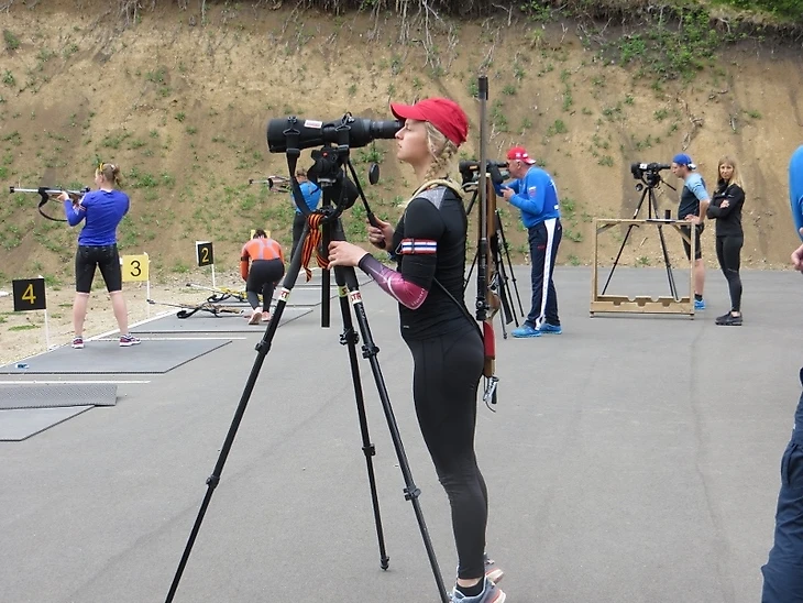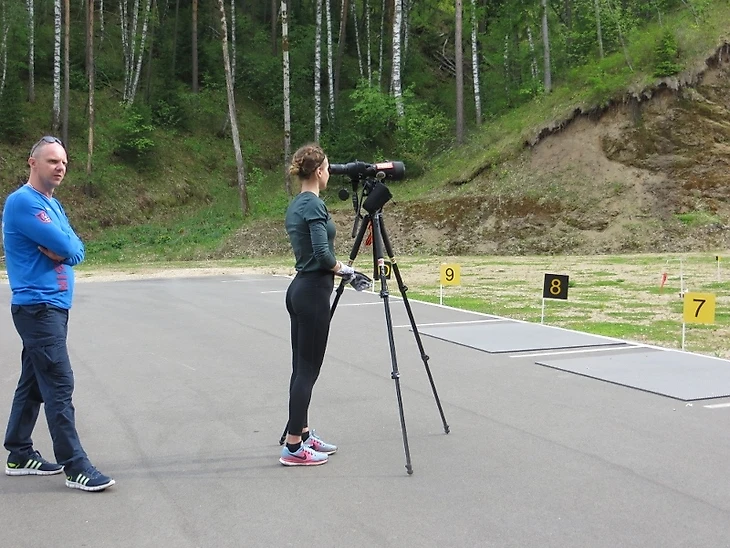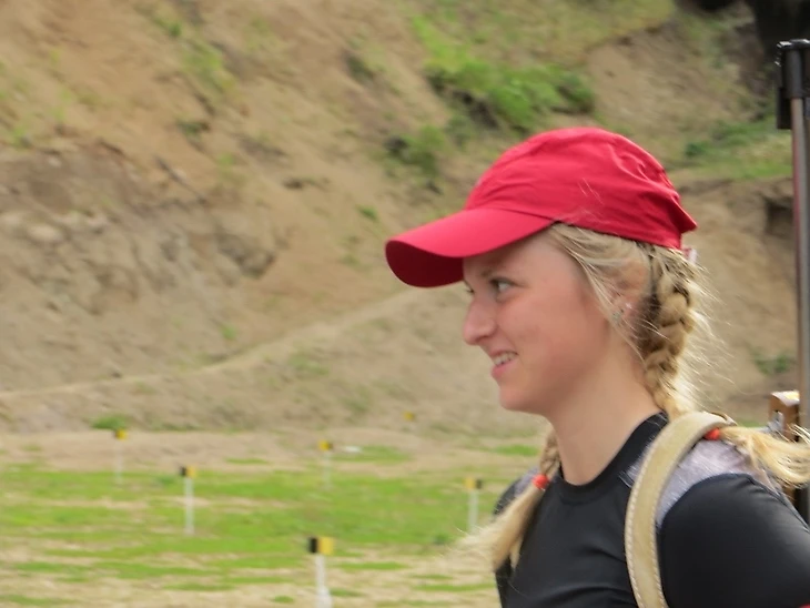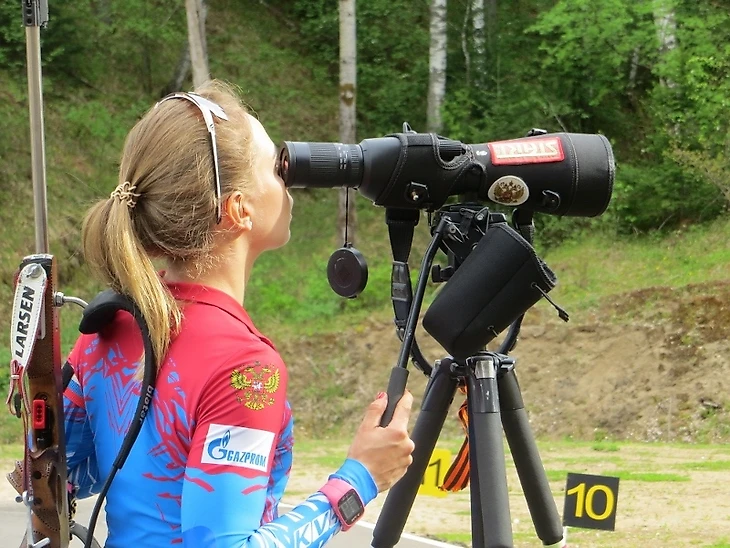 25 мая перед обеденным перерывом я попросила доктора женской сборной Евгения Георгиевича Шутова, чтобы он помог мне информацией о том, где и когда можно будет встретиться с юниорской сборной по биатлону (и с девушками, и с парнями). Он сказал, что уточнит и скажет мне об этом на стрелковой тренировке женской сборной. А там я так "зафотографировалась", что забыла и думать об юниорах. Уже ближе к концу тренировки подошла к Евгению Георгиевичу и напомнила ему о своей просьбе. Он кому-то позвонил и сказал, что мне никуда идти не надо: обе юниорские сборные будут по очереди проводить стрелковые тренировки на этом стрельбище. Радости моей не было предела: никуда не надо было идти с обжитого местечка, что, с учётом ноющего колена, можно было считать большим везением. Когда женская сборная ушла играть в волейбол, я немного отдохнула, посидев на скамейке и созерцая вот эту любимую картинку. Николай Степанович Загурский ещё не покинул рабочее место, а к скамейкам уже подошли девушки со своими вещами и оружием. Анастасия Кайшева, которую я хорошо знала в лицо, немного задержалась о чём-то переговорить с тренером старших, а из тех, кто подошёл, я смогла опознать только одну девушку (не так давно её фото видела на сайте в "Вк"). Это была Ксения Довгая. И то, называя её, я промахнулась с именем: назвала Алиной. Девчата удивились, что я вообще знаю хотя бы кого-то. Я поняла, что они и сами ещё не очень близко знают друг друга, потому что кто-то из них начал уточнять у Ксении, где правильно ставить ударение в фамилии. Ксения ответила, что верно с ударением на первый слог:ДОвгая (я так и назвала). Представилась девчатам, рассказала, что всегда слежу за их выступлениями по сивидате, что таких болельщиков немало. Поэтому их имена/ фамилии мы знаем, а вот в лицо- мало кого. Начали знакомиться.