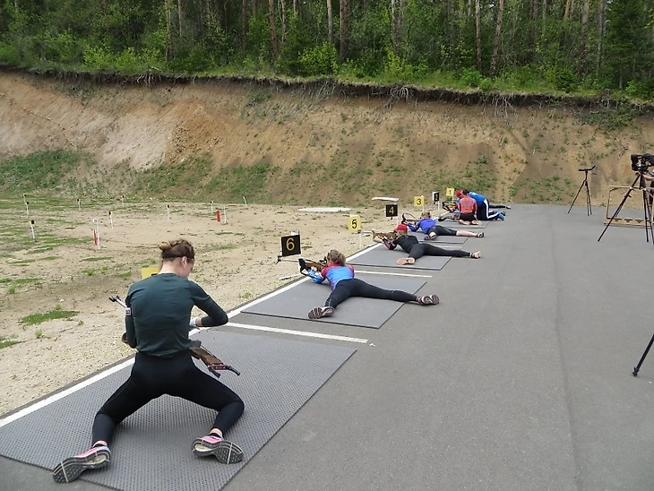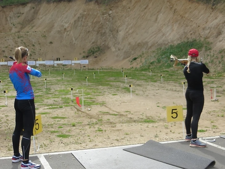 Лёжа стреляет Амина Иванова, стоя - Катя Понеделко.