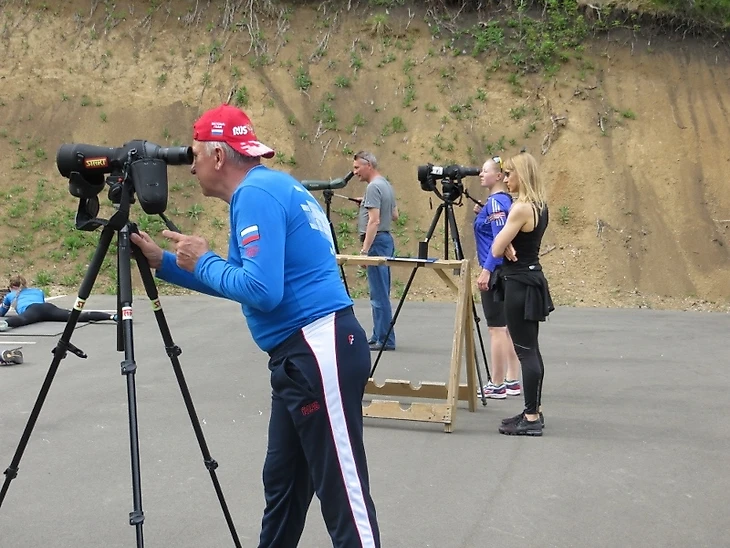 Примерно в это время (а может, чуть пораньше) я заметила, что в гору поднимаются ещё двое человек: мужчина и девушка. Вот их я хорошо знала в лицо. Подошла к ним сразу же, то есть первой встретила их на стрельбище. Сначала обратилась к девушке, не столько спрашивая, сколько говоря утвердительно: "Елизавета Кожевникова". "Да",- удивлённо ответила она. "А вы- Большаков Николай... а вот отчество - не знаю", - продолжила я. "Геннадьевич",- ответил старший тренер по резерву (так значится он по должности на сайте СБР) и продолжил: "А вы- из КГБ!" . Мне бы надо было сказать, что КГБ давно нет, но я запротестовала: "Что вы! Я- простая пенсионерка, болельщица!"