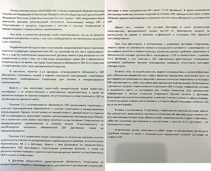 «Перед началом сезона 2019/2020 нам (членам спортивной сборной команды Российской Федерации по биатлону) Общероссийской общественной организацией Федерация биатлона «Союз биатлонистов России» (далее – СБР) предложено было заключить Договор, регулирующий отношения, возникающие между СБР и Спортсменами в процессе подготовки к участию и участию Спортсменов в международных и всероссийских соревнованиях.