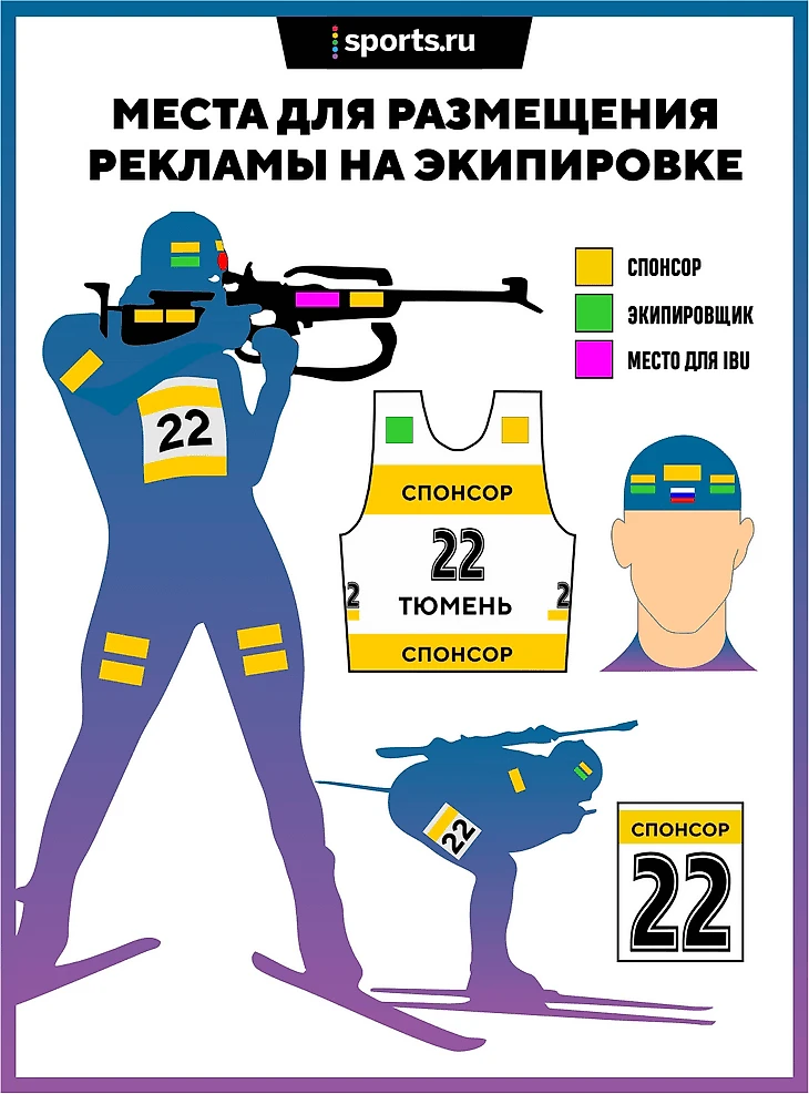 Команда отметила только три проблемные зоны: шапка, винтовка, костюм. А вообще, мест для рекламы еще много: ремни винтовки, ремни на руках, очки, перчатки, разные чехлы, пояса, бутылки, даже наушники/затычки от шума. Регламент IBU прописывает все вплоть до площадей, логотипами на этих предметах тоже можно зарабатывать – но, видимо, по ним спора нет.