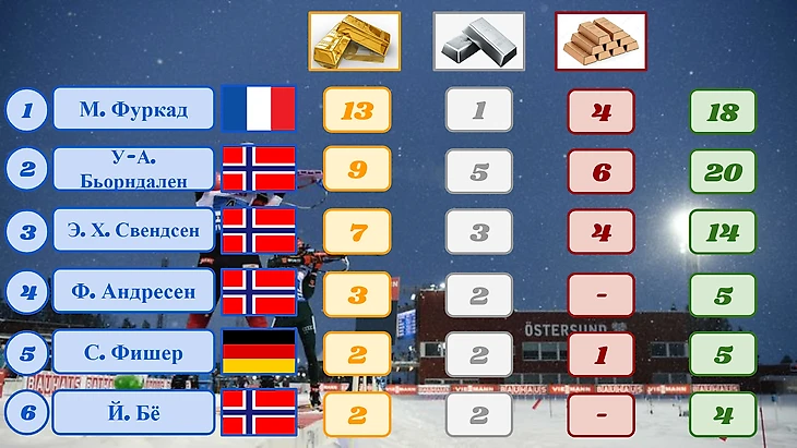 Теперь рассмотрим личные успехи спортсменов. И среди мужчин лидирует Мартен Фуркад. При этом у него больше побед, чем у всех мужских сборных, не входящих в ТОП-4, вместе взятых (13 против 12). Второе место занимает великий и ужасный Уле-Айнар Бьорндален, лидер по количеству медалей. Тройку замыкает Эмиль Хегле Свендсен. Эта троица выиграла практически половину гонок (29 из 64). Всего в Эстерсунде 33 биатлета побеждали в личных гонках.