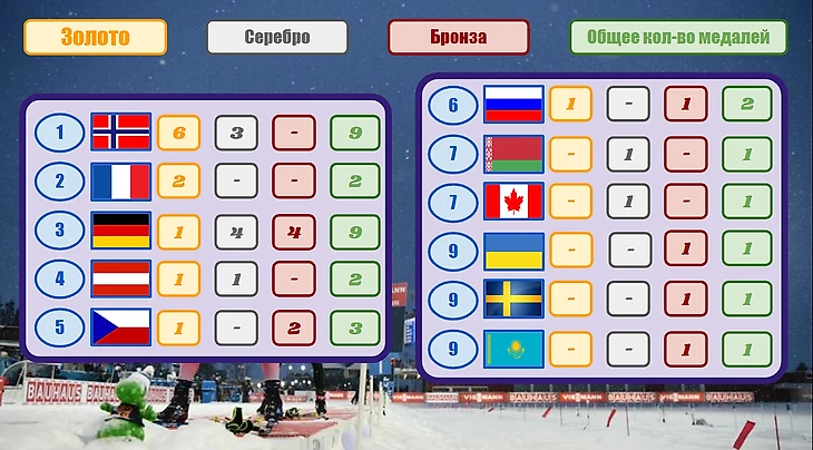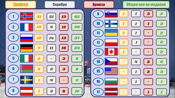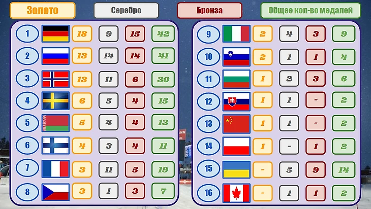 Теперь остановимся на прошедшем ЧМ. Он проходил с 7 по 17 марта. На 53-ем главном старте было разыграно 12 комплектов медалей. И впервые на чемпионате мира была проведена одиночная смешанная эстафета.