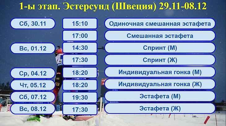 Кубок мира открывают смешанные эстафеты, что стало традицией. Но вот дальше произошли интересные изменения. Впервые с сезона 00/01 на первом этапе кубка мира будут отсутствовать гонки преследования. Зато появились классические эстафеты, которых не было с 2005 года. Также поменялись местами спринт и индивидуалка, что также выглядит необычно.