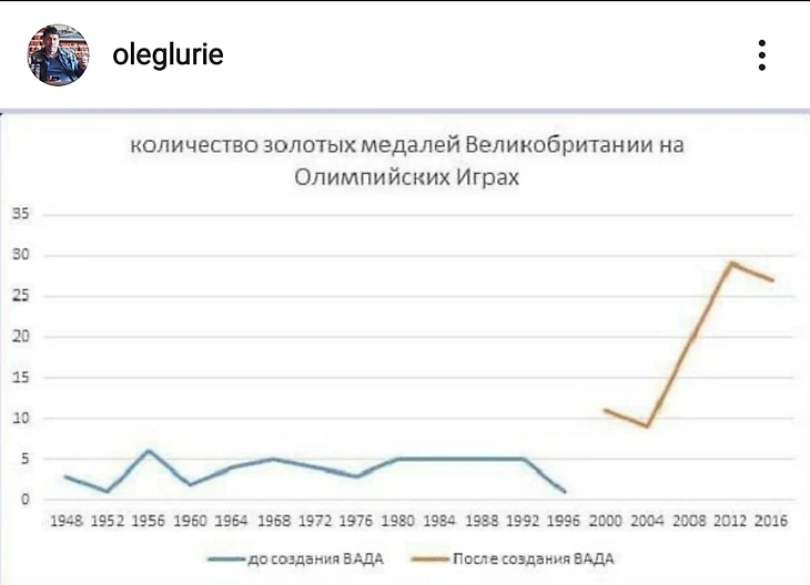 Интересный график опубликовал в своем твиттере журналист Олег Лурье. С появлением WADA (всемирное антидопинговое агентство) показатели Великобритании на олимпийских играх заметно улучшились. Мое мнение весь большой спорт давно стал соревнованиями фарм-технологий, а не силы,воли и мастерства. Пишите ваше мнение в комментариях , буду благодарен каждому +