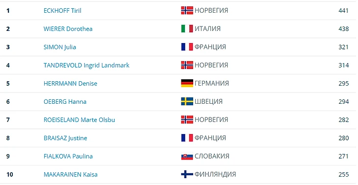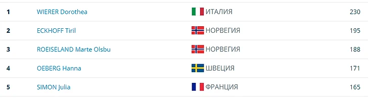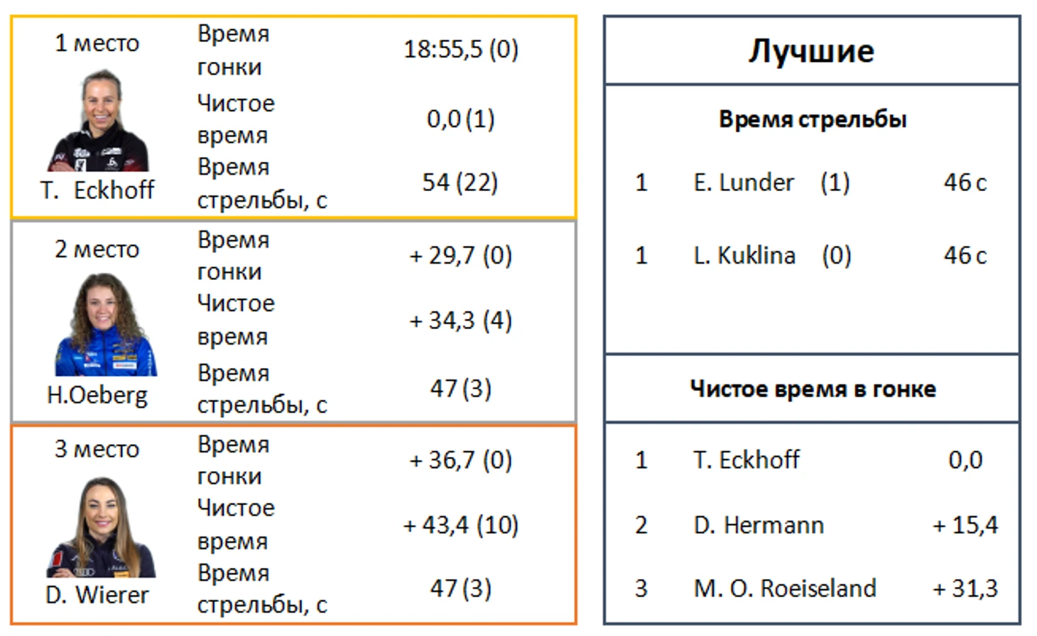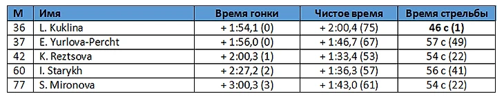 Провальная гонка получилась для наших биатлонисток, из плюсов стоит отметить только быструю и точную стрельбу Куклиной, ходом же отставания очень большие, самая быстрая из наших К. Резцова с отставанием более 1,5 минут.