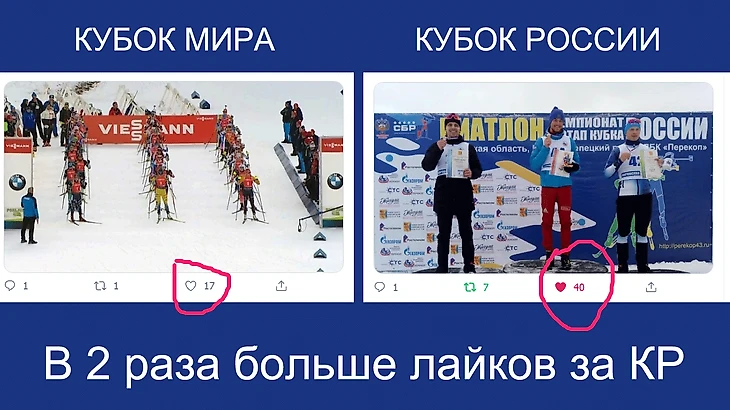 Обзор твиттера СБР наглядно показывает, что все эти допинги и косяки сделали своё дело. Кубок мира теряет свою аудиторию. Вместе с тем Кубок России набирает обороты. Ждём с нетерпением трансляций из России.
