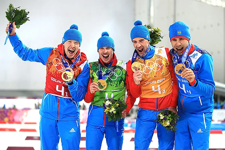 С дисквалификацией Евгения Устюгова (второй слева на фото) Россия потеряла золото в биатлонной эстафете и съехала с первой строки.