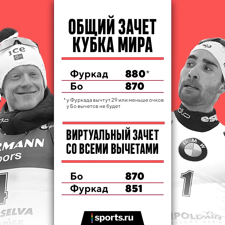 • Виртуально Фуркад отстает от Бо на 19 очков – для победы в Кубке мира надо отыграть 20. Потому что при равенстве выше окажется Йоханнес – за счет большего количества побед в сезоне.