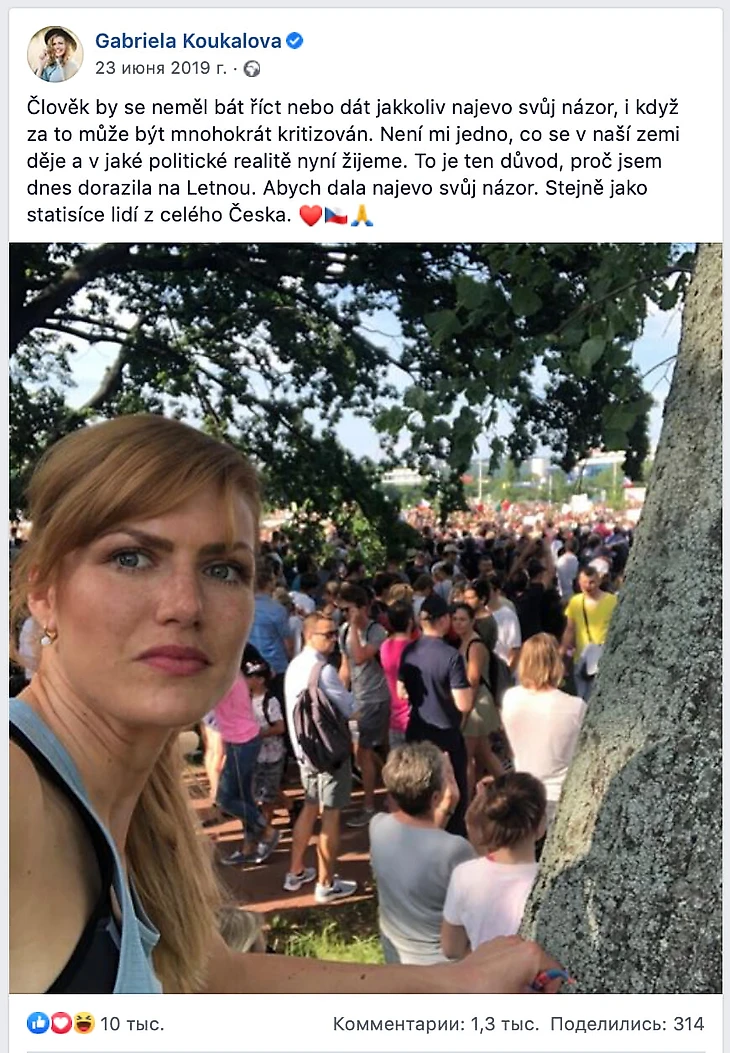 «Не бойтесь высказывать мнение, даже если вас за него потом будут критиковать. Мне не все равно, что происходит в нашей стране и в какой политической реальности мы сейчас живем. Вот почему я пришла сегодня в Летну. Чтобы выразить мнение. Как и сотни тысяч других людей со всей Чехии», – написала Коукалова.