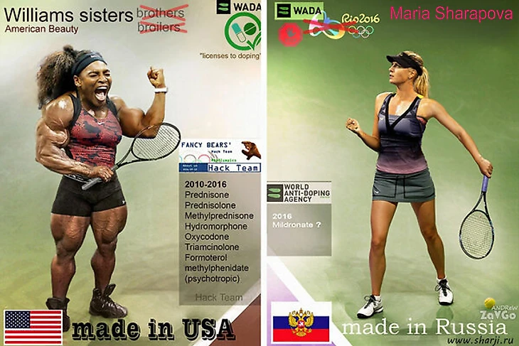 На десерт я поставил картинку, которая наглядно, пусть и несколько гиперболизировано, показывает нынешнее состояние допинга в современном спорте. С одной стороны напичканная запрещённой химией, вплоть до тяжёлых наркотиков "чистая" англо-саксонская "мать всех матерей". С другой - "допингистка"из "неправильной" страны, в пробе которой было обнаружено лишь плацебо, не соответствующее ни одному из трёх критериев определяющих вещество как допинг.
