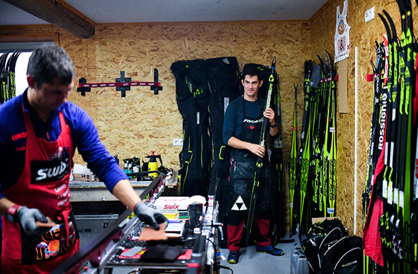 Все расписано пофамильно: кто чем занимается, кто кого курирует. Один сервисер отвечает за одного-двух спортсменов для детального понимания: чтобы сервисеры знали конкретные лыжи, предпочтения спортсменов.