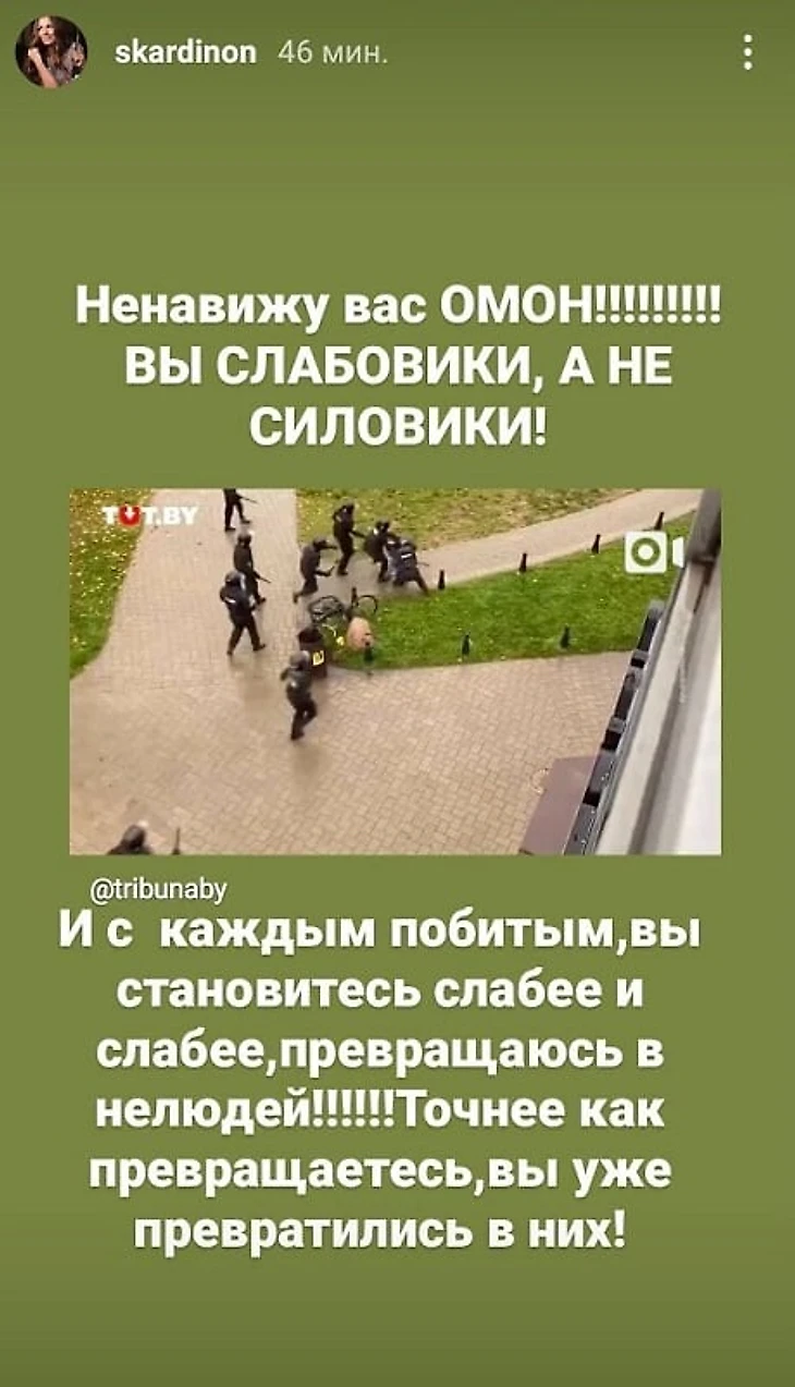 Потом почему-то эти самые сторис удалил Инстаграм. Видимо, за излишнюю жестокость.Между тем, в соцсетях белорусы пишут, что ждут реакции Дарьи Домрачевой и для них это действительно важно.