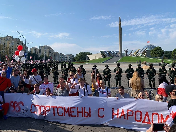 Спортсмены в стороне не остались. На одной из воскресных акций была целая колонна атлетов, выступавших за Белоруссию в разных видах спорта. Наиболее активно высказывались трехкратный призер Олимпийских игр по плаванию Александра Герасименя и капитан баскетбольный сборной Елена Левченко. Последняя на прошлой неделе за эту акцию получила 15 суток ареста.