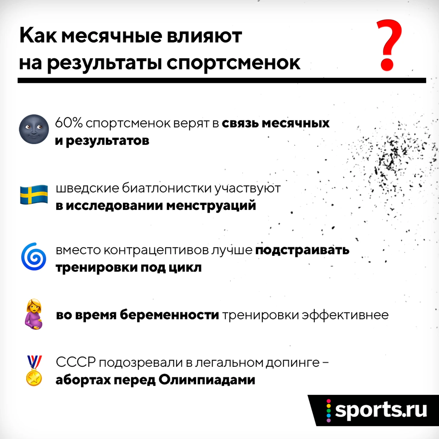 Спортсменки редко говорят о менструации. Хотя бывают и исключения: вице-чемпионка Пекина-2008 в беге на 10000 метров Шалан Флэнаган в 2017-м написала в твиттере, что за всю карьеру у нее ни разу не было сбоя в цикле. Она обратила на это внимание, потому что отсутствие месячных кажется для спорта нормальным явлением, хотя так быть не должно.