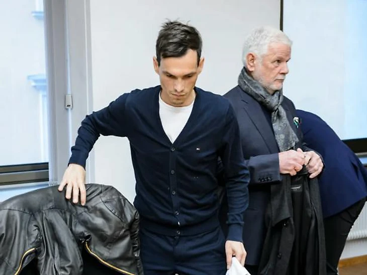 Бывший профессиональный велосипедист Штефан Денифль (слева) со своим адвокатом Вильфридом Платтнером на судебном процессе в феврале (окружной суд Инсбрука).