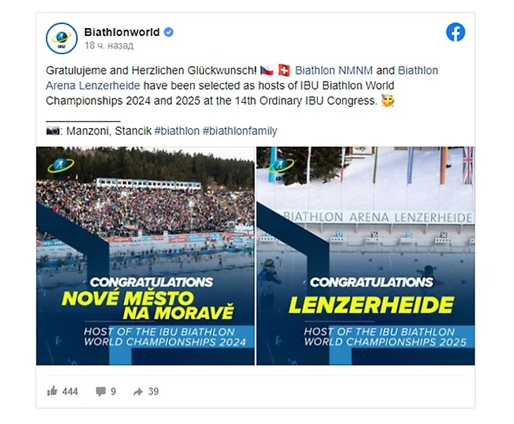 Чехия во второй раз примет Чемпионат мира по биатлону. На «Высочина-Арене» в Нове Место на Мораве будут разыграны медали в 2024 году. Это решил конгресс IBU, который из-за пандемии в первый раз принимал подобное решение онлайн.