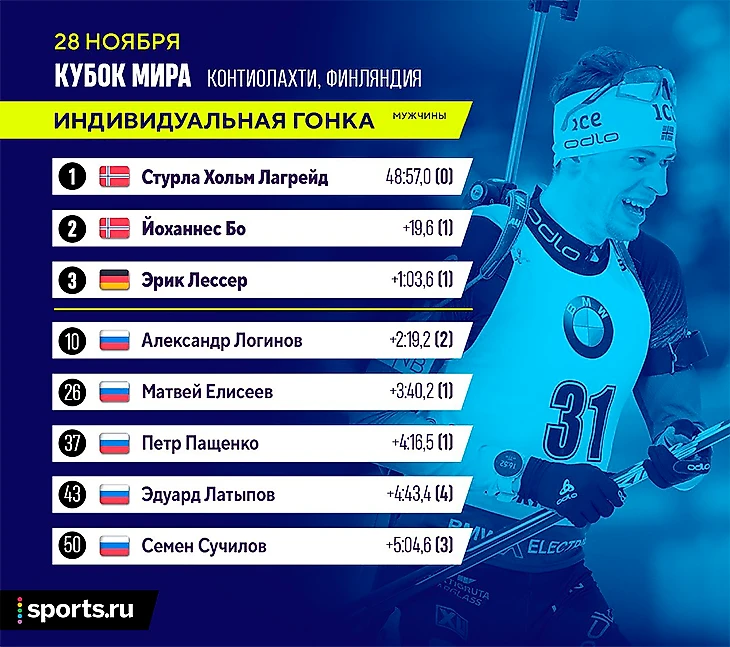 Теперь показатели еще опаснее – 1 промах на 80 выстрелов, изматывающая индивидуалка покорилась Лагрейду визуально легко. Впрочем, он точно не медленный снайпер: сегодня у него седьмая скорость, быстрее любого из русских биатлонистов, менее минуты проигрыша Йоханнесу Бе.