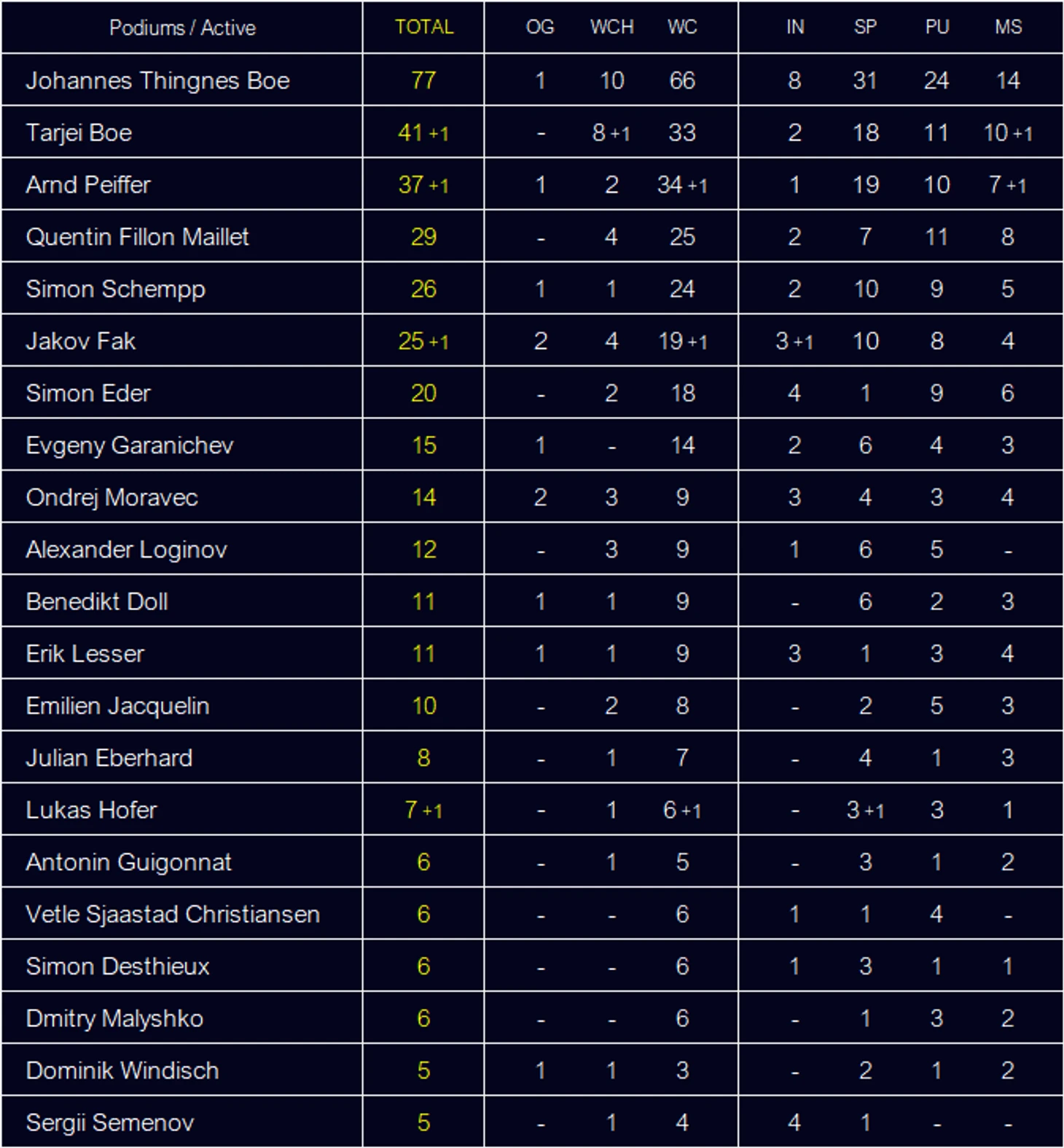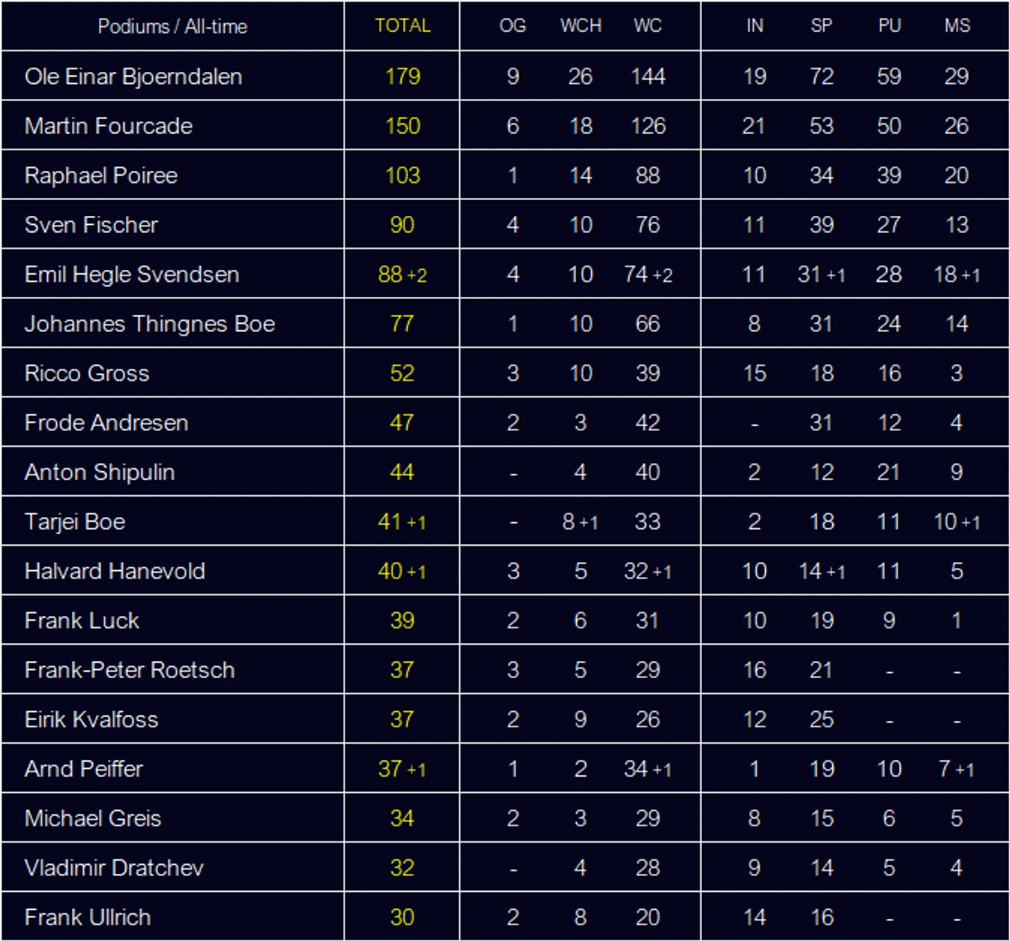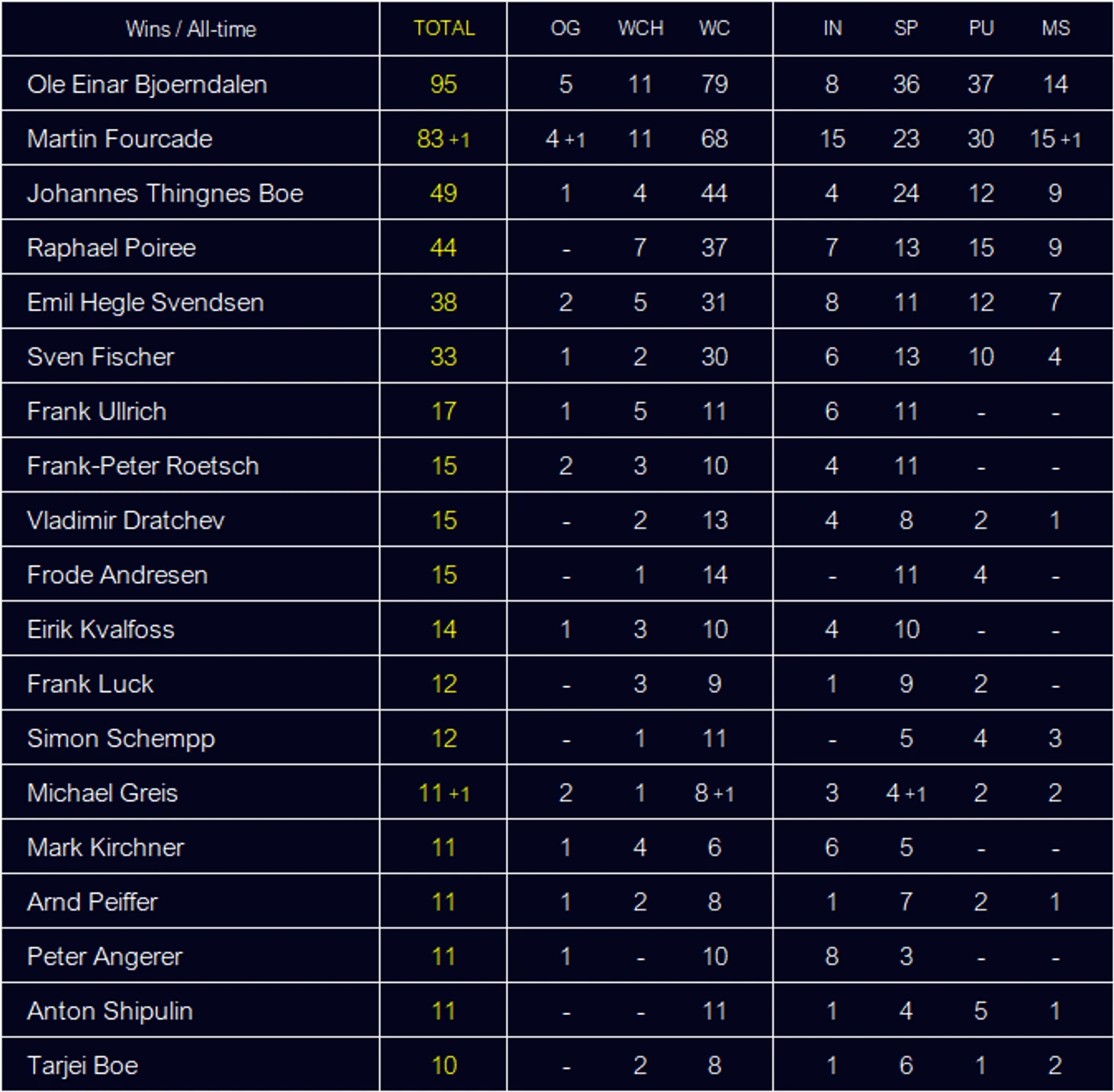 Очередной апдейт списка самых успешных биатлонистов — исторических и действующих.