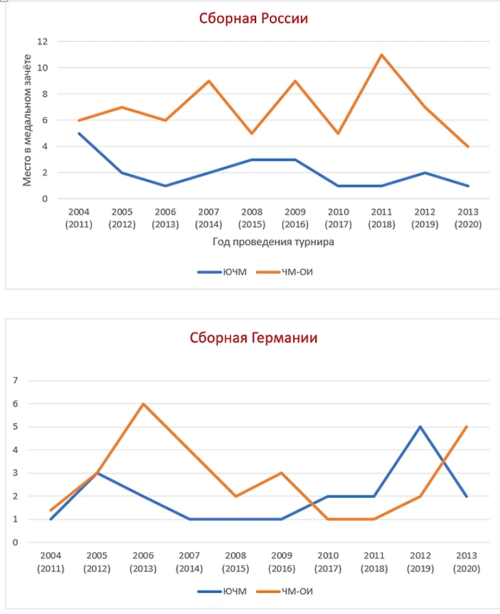 Так вот, результаты российских сборных на юношеских и взрослых чемпионатах мира (олимпиадах) вообще не связаны друг с другом.