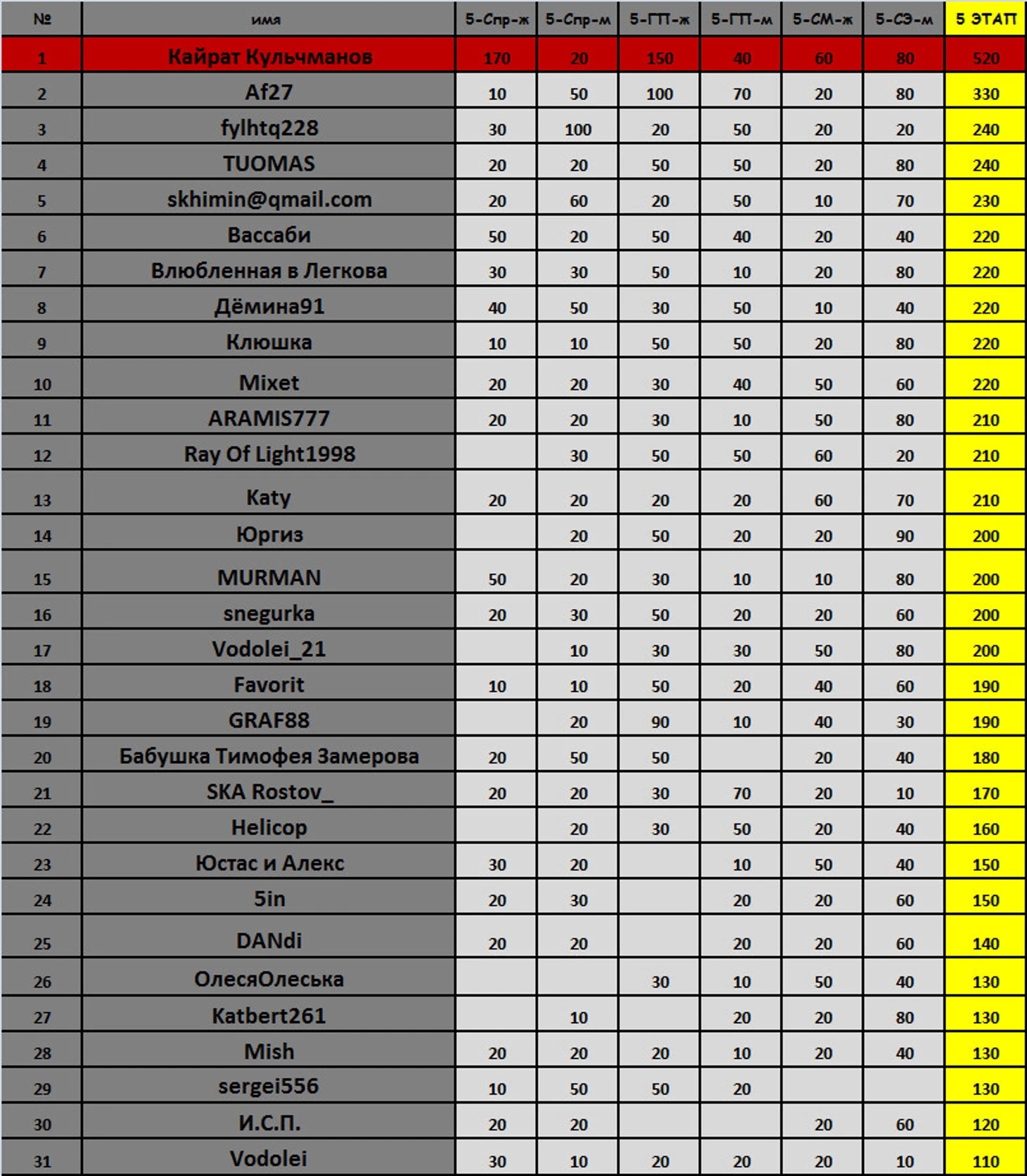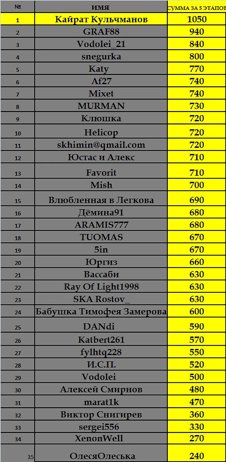 Подведем итоги уже 5-го этапа. С огромным преимуществом на 5 этапе одерживает Кайрат Кульчманов. (прям как Большунов на Тур де Ски)
