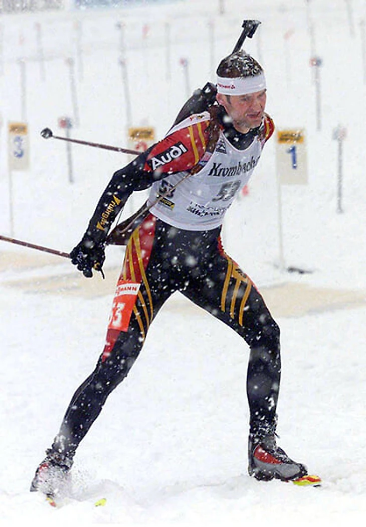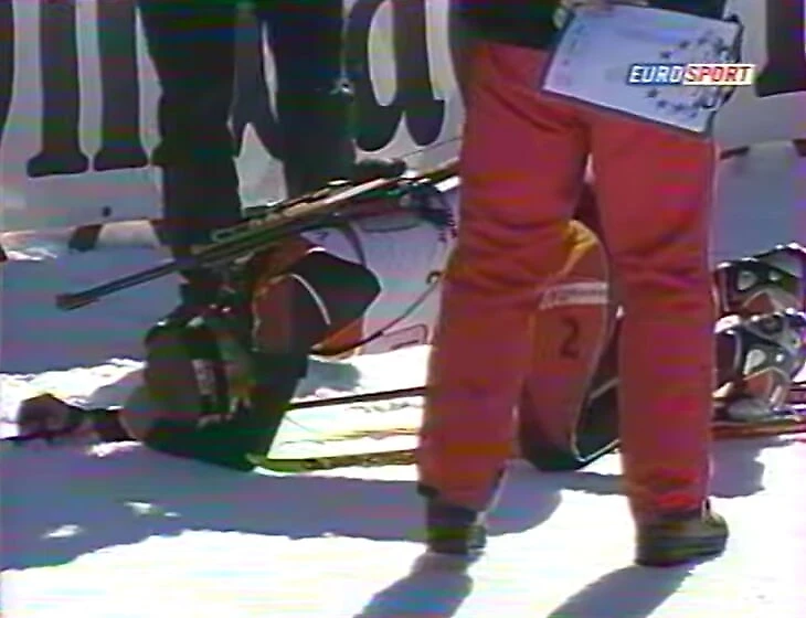 Это уже декабрь 2001-го. Германия лидировала на протяжении трех этапов, Моргенштерна поставили финишером, и он снова не справился: зашел на круг после лежки и упустил лидерство, вторую стрельбу провел чисто, но в конце встал примерно так же – в этот раз немцы снялись.