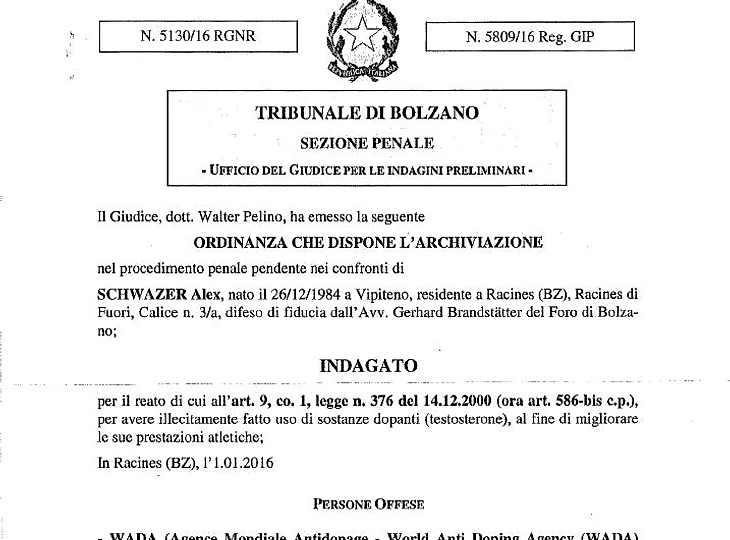 Как уже сообщалось, судья из Больцано Вальтер Пелино распорядился прекратить уголовное дело против южно-тирольского чемпиона ОИ-2008 по спортивной ходьбе Алекса Швацера.