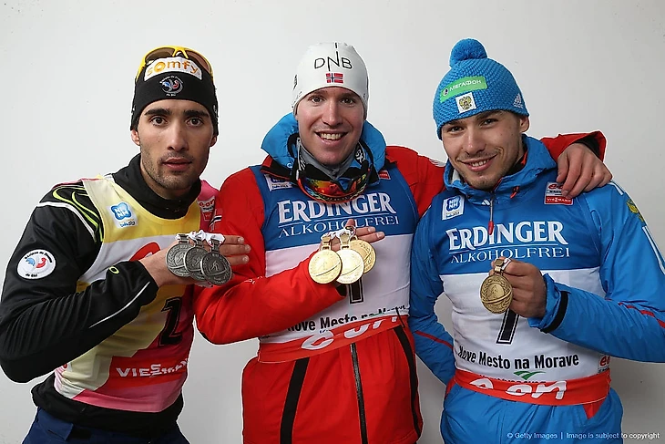 Сразу три наших биатлониста завоевали на чемпионатах мира по 7 медалей. Ребята были из совершенно разных поколений. Сергей Рожков, например, бегал еще в 90-е. Сегодня его бы назвали "опытным эстафетным бойцом". Все свои медали Сергей завоевал в командных гонках. Золото и три серебра в классических эстафетах, одно серебро в смешанке и еще одно серебро с бронзой в экзотической нынче командной гонке.