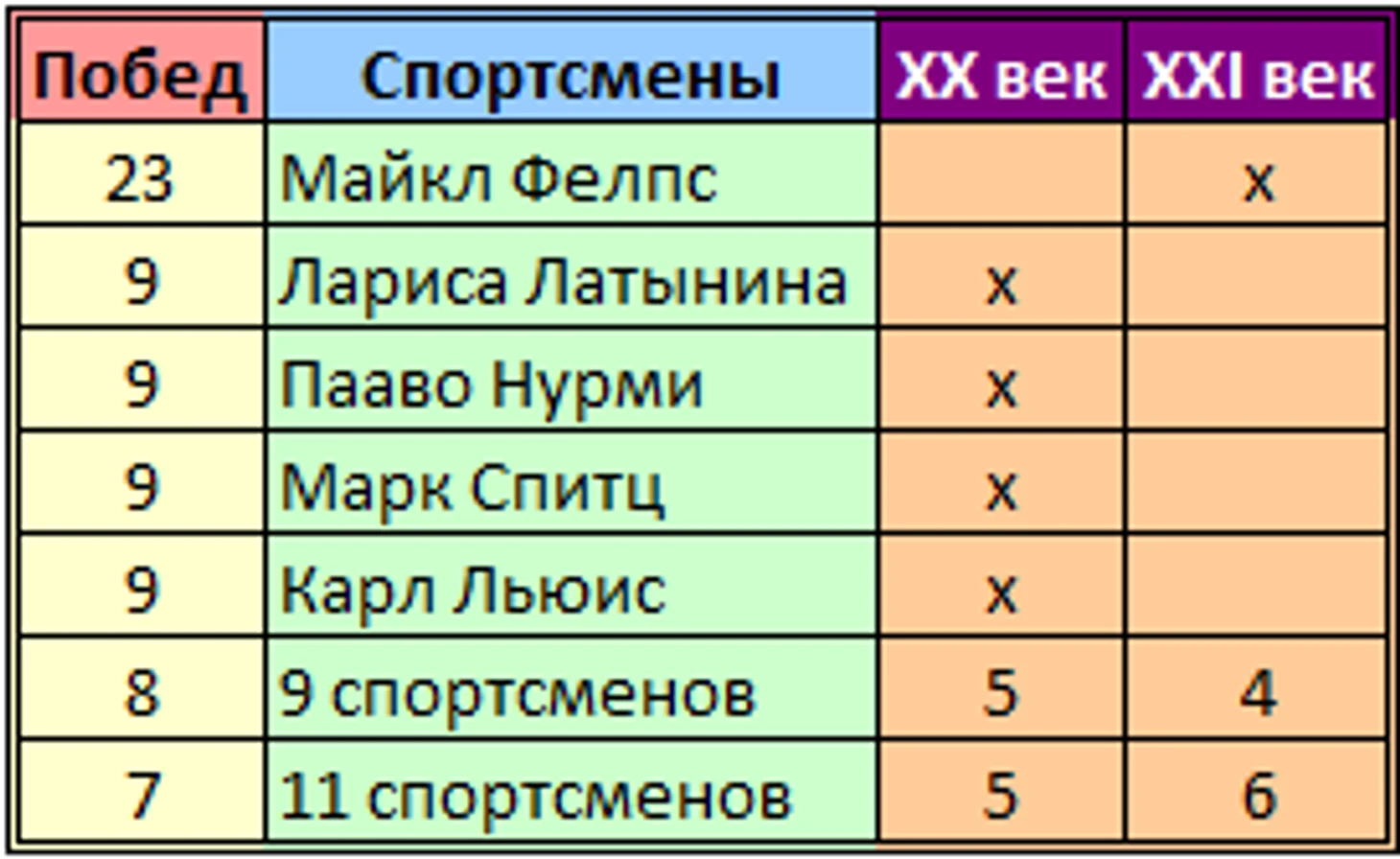 Правда, четыре из этих семи у Эммы были эстафетными. Вот вам ещё одна табличка из серии «вряд ли кто-то когда-нибудь давал вам такую»: лидеры по количеству командных побед на Олимпиадах: