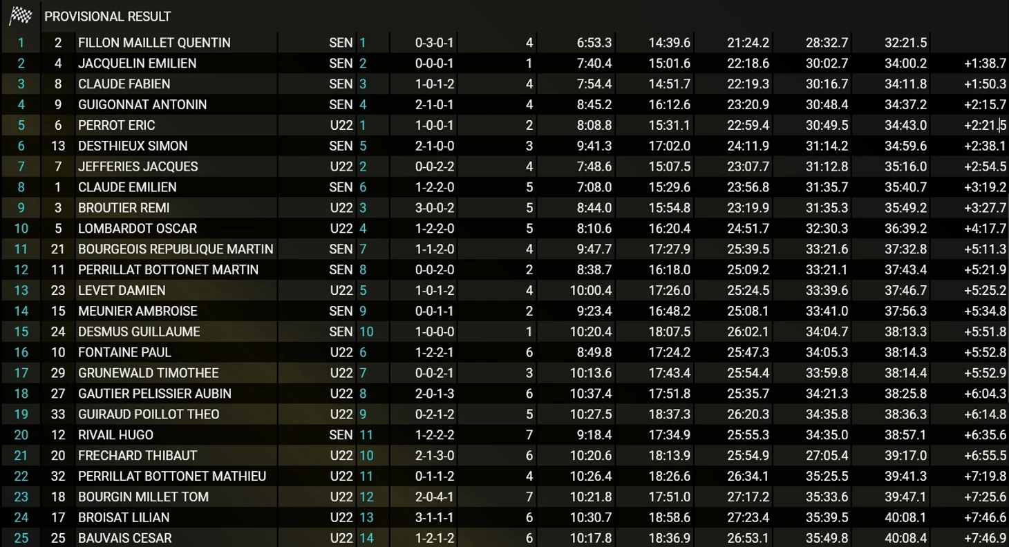 А вот для команды Виттоза день откровенно не сложился — хотя, судя по протоколам, винить в этом следует не Венсана, а Патрика Фавра, тренера по стрельбе :) Лучше всех справился Кантен Фийон Майе, занявший второе место, однако два штрафных круга не позволили ему подняться на верхнюю ступеньку пьедестала при безупречной стрельбе юного соперника. Остальные мушкетёры и вовсе остались вне подиума, зато для резервной команды в субботу выдался настоящий праздник. Помимо победителя гонки, очень здорово выступили Эрик и Оскар, опередившие половину взрослой сборной. А третье место неожиданно занял ещё один юниор — Реми Бротье (судя по всему, Симон Фуркад отлично выполняет свою работу!).