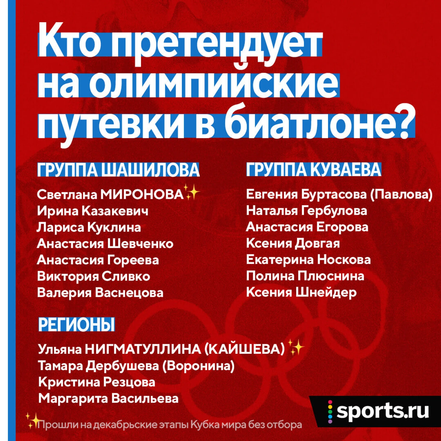 Вскоре Правление СБР отредактировало проект Шашилова: по окончательной версии на декабрьские этапы Кубка мира попадают девушки из топ-20 – такой формат, конечно, приняли ради Нигматуллиной. Понятно, что многолетняя ученица Шашилова Светлана Миронова и так вошла бы тренерским решением в пятерку.