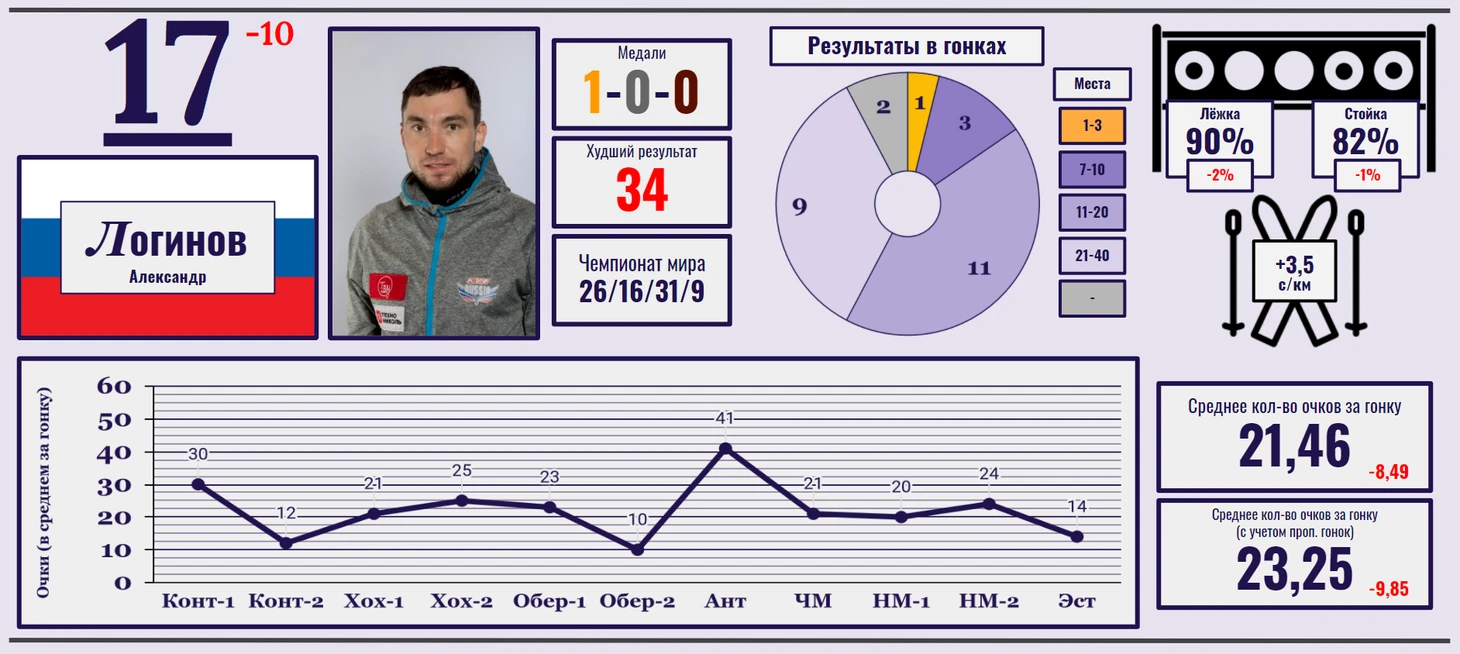 По сравнению с сезоном 19/20 Логинов немного сдал ходом, также хуже стала и стрельба, особенно в эстафетах. Болезнь последнего выстрела стоит отдельного разговора, уж очень много гонок было ею подпорчено.