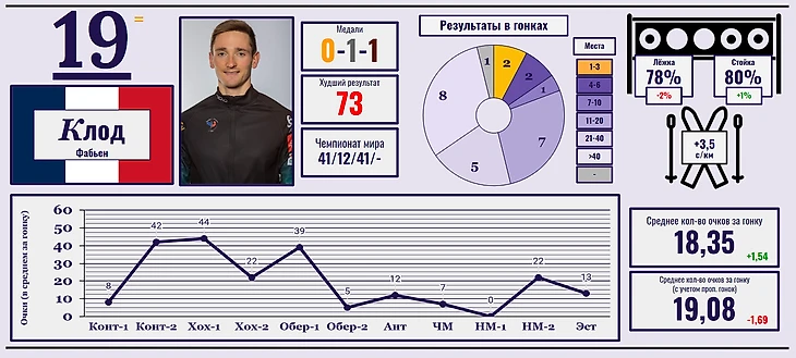 Начало сезона для средненького Клода выдалось очень ярким - несколько призовых мест, отличный ход и 10 строчка тотала после пяти этапов. Но затем последовал труднообъяснимый спад, француз стал очень много промахиваться, да и форма была уже не так хороша, как в декабре. По факту до конца сезона Фабьен так и не смог очухаться.