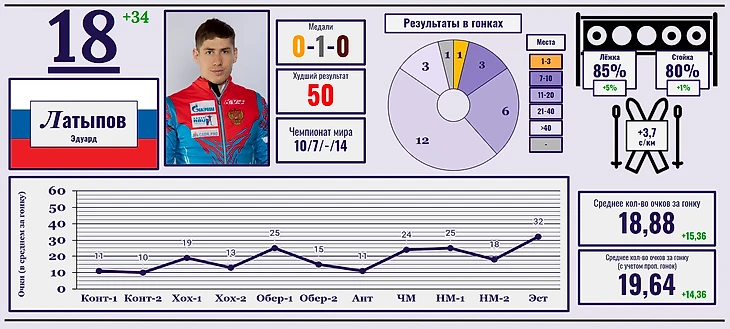 Но полюбился Латыпов болельщикам в первую очередь благодаря прекрасно проведенным эстафетам. Именно в них он проявлял все свои лучшие качества. Эдуард - один из самых стабильных эстафетчиков сезона. При этом ему пока сложно наравне бороться с примами, от них приходится ждать ошибок.