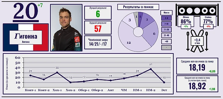 На самом деле грустно смотреть на нынешние результаты Гигонна. После ЧМ-2019, на котором француз завоевал серебро в гонке с общего старта, вместо ожидаемого прогресса последовал серьезный спад. Масс-старт, конечно, тот еще был, ни один из медалистов после ничего особо путного не показал. Но в любом случае, печально осознавать, что та гонка, возможно, - пик всей карьеры француза.