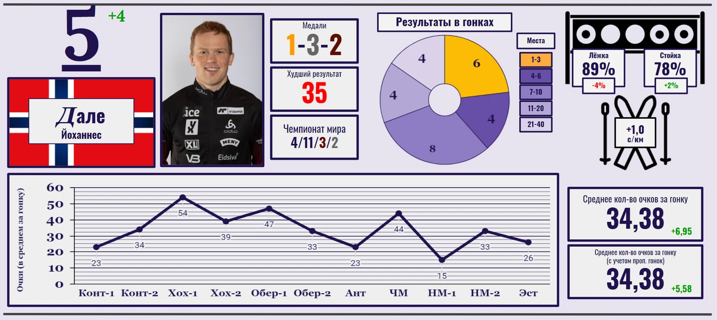 Не смотря на все неудачи в эстафетах, сезон для Йоханнеса Дале получился великолепным. Для справки, 9 из 10 лучших результатов карьеры, пусть и недолгой, были показаны именно в 20/21. Если норвежец продолжит также прогрессировать, то в скором времени будет явным претендентом на победу в общем зачете.