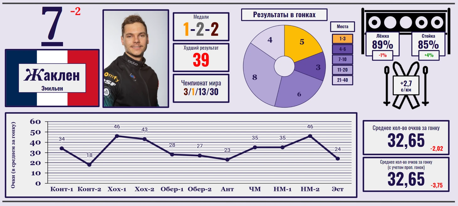 Жаклен провел весьма спорный сезон, с одной стороны отсутствие стабильности и многими ожидаемой борьбы за Хрусталь, с другой - очередное личное золото чемпионата мира и неплохая 7-я строчка в тотале. Я вот до сих пор не определился - успех это или провал. С другой стороны, всем бы такие провальные сезоны.