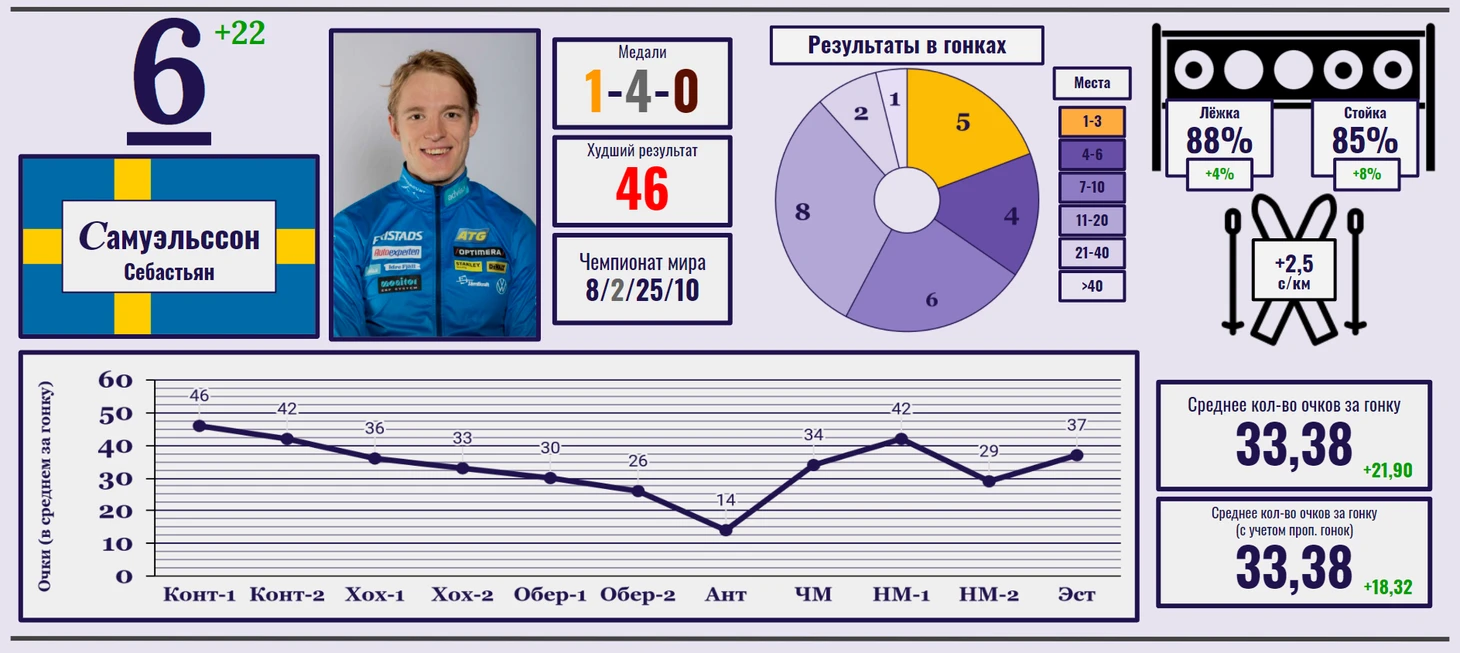 Впервые громко о себе заявить швед смог во время Олимпийских Игр в Пхенчхане, завоевав там серебро в преследовании и золото в эстафете. Затем последовали 2 довольно сложных сезона, во время которых Самуэльссон лишь изредка напоминал о себе именно результатами, а не высказываниями в прессе. И уже стало казаться, успехи в Корее были скорее случайностью. Но шведу все-таки удалось переломить ситуацию, в прошлом сезоне он был реально хорош. Самуэльссон впервые смог выиграть гонку на кубке мира, завоевать личную медаль чемпионата мира, финишировать в ТОП-10 общего зачета.