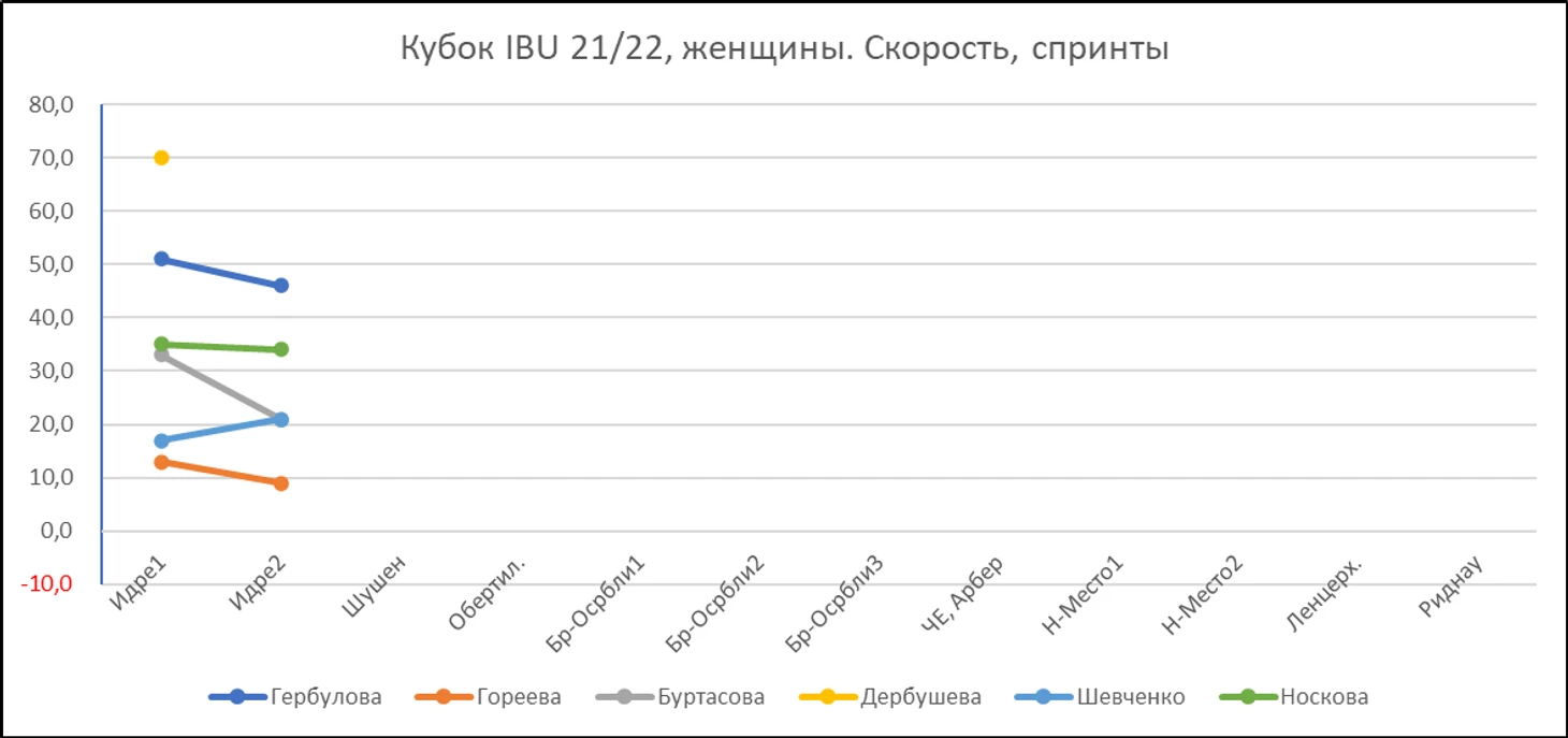 На рисунке 1 раскладка по кругам в первом спринте первого этапа. Цифири на оси - отставание ходом от среднего первой пятёрки скоростниц на круге (по традиции). Видно невооружённым взглядом, что только двое - Шевченко и Буртасова ровно прошли всю дистанцию. Но у Насти отставание на каждом круге меньше, чем у Жени. Катя Носкова явно прибавила на последнем круге. Правда, после "просадки" на втором круге. Но и эта прибавка оказалась хуже скорости Шевченко на последнем круге. Можно ли заподозрить плохую стрельбу у Гербуловой и Гореевой причиной падения скорости по дистанции? На Горееву это не похоже, она, насколько помню, не "забивает" на гонку. За это, в том числе, её Шашилов и ценит. Значит, Настя ещё в процессе набора формы, разбежится. Что происходило со скоростью Тамары, нам не сказали. Но невыход на второй спринт по-своему объясняет. Здоровья Тамаре!