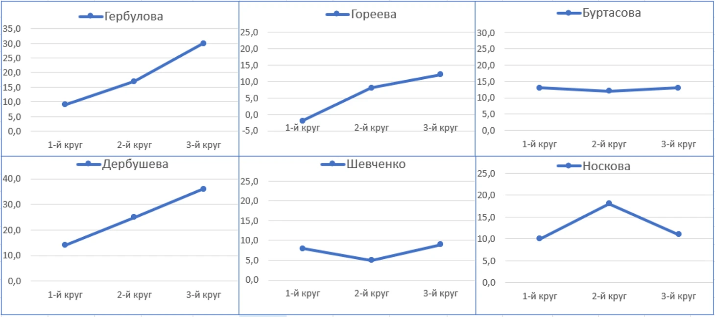 В субботу в раскладах картина так или иначе поменялось почти у всех (Рис.2). Качественнее прошли дистанцию Гербулова, Гореева, Буртасова. На последнем круге немного подсели Шевченко и Носкова.