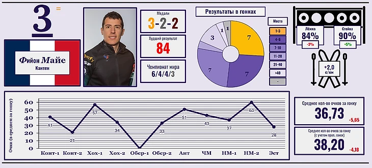 При этом в прошлом сезоне Фийон Майе умудрился показать худший результат в карьере - 84 место в спринте Оберхофа, еще и в преследование не попал. В итоге он единственный представитель ТОП-10 тотала, которому не удалось пробежать всю программу личных гонок на кубке мира.