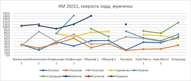 Карим ногами отстаёт. "Все" знают, что при подготовке к предыдущему сезону Карим с Сориным набирали объёмы. Затем Карим их переваривал. И в этом сезоне ожидалось ускорение. Глядя на предыдущий график, можно увидеть, что Карим стартовал с почти что лучшей скоростью предыдущего сезона (лучший ход у него был на втором этапе Нове-Место). Предлагаю расценивать это как признак его ускорения. С оговоркой, что он должен разбежаться. Поймал себя на мысли, что как-то слишком часто в обзорах вчера и сегодня встречается у меня слово "разбежаться".