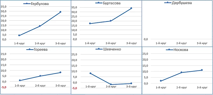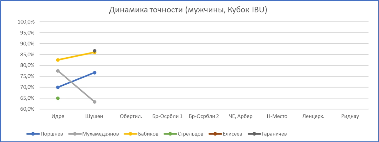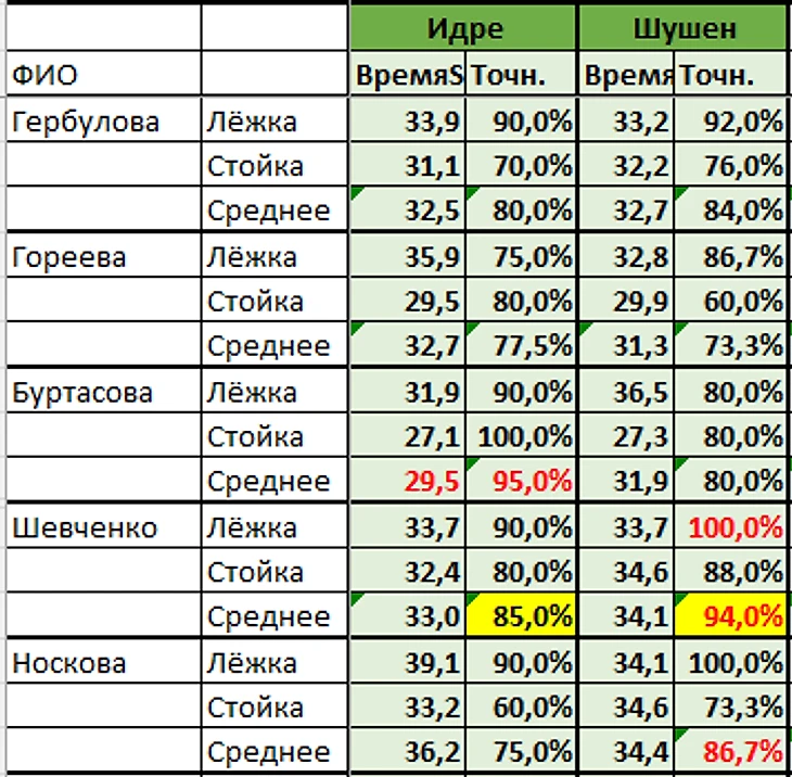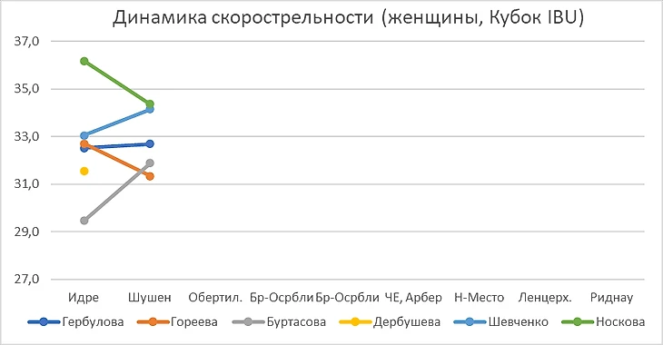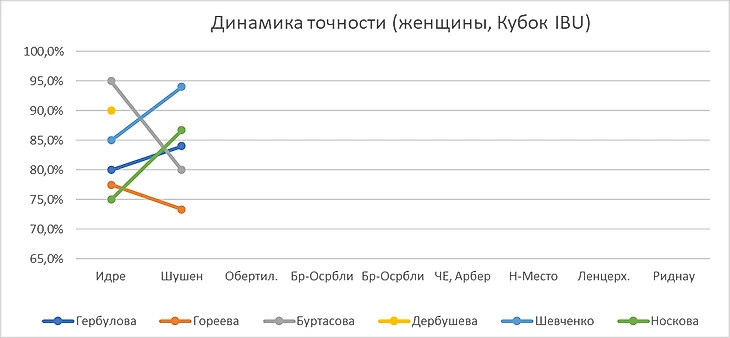 Несколько слов про динамику показателей стрельбы напишу по графикам. Почти у всех заметные перепады точности. Трое повысили точность: Шевченко, Носкова и Гербулова. У двоих упала: Буртасова (видимо, на фоне болезни) и Гореева. Настя явно не в форме пока. Ждём.