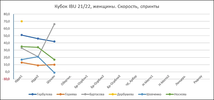 Разбирая скорость в пятничном спринте наших девушек, не обойдусь без Стины Нильссон. Обратил внимание на её раскладку. Но обо всём по порядку. На графике ниже динамика скоростей наших девчат уже на протяжении трёх спринтов. Заметно меньше хаоса (больших разнонаправленных перепадов), чем у парней. Относительно первого спринта ускорились или заметно ускорились четверо. А вот Женя заставляет задавать вопрос: что это? В пятницу просто провал по скорости. И это на Кубке IBU. Никаких выводов, просто вопрос: Женя, что произошло? Или происходит? Писал это до объявления о болезни Жени. Вопросы снимаю. Тамара из-за болезни пропустила уже два спринта. Когда ей надо стартовать, непонятно. Знают ли это доктора? Надеюсь, после перерыва на Кубке IBU будет в порядке.