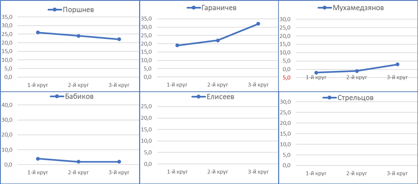Раскладка по кругам смотрится в целом симпатично. Елиссев и Стрельцов не выступили на этапе, но я не стал удалять их графики. Как минимум, чтобы не забыть, почему графики только для четверых. Поршнев разложился грамотно, чуток ускоряясь на каждом следующем круге. Осторожно нащупывает скорость? Приятно смотреть на график Антона. Для меня его скорость в Шушене, пожалуй, приятная неожиданность. Как и то, что с такой скоростью прошёл ровно всю гонку. Раскладка Ильназа, по мне, вполне приемлемая. Чуть медленнее прошёл третий круг. Но, глядя, на каком уровне это "чуть медленнее", не вижу никакой проблемы.