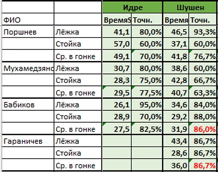 В табличке по этапу в Шушене выделил цветом три показателя: 100%-ю точность Шевченко на лёжке, её среднюю точность 94% на этапе, и среднюю точность Носковой в 86,7% (не только для неё высокую). Ну, а Настя выдала гроссмейстерскую точность. Что важно: Настя одновременно ускорилась на дистанции и подняла точность стрельбы. Оптимальная форма? Посмотрим, что будет дальше.