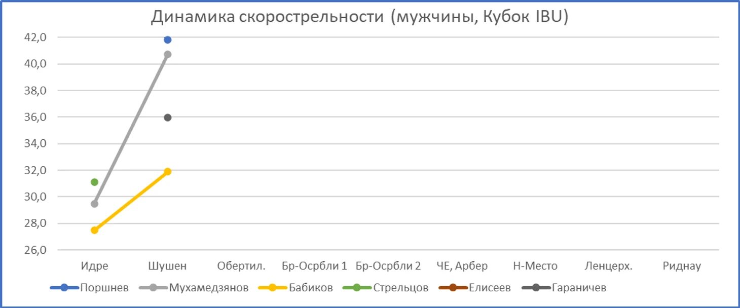 Динамику опишу по графикам. Бабиков с резким ускорением ногами улучшил точность, принеся в жертву скорострельность (на следующем графике это хорошо видно). Жертва оказалась оправданной - золотой дубль при хорошей скорости и стрельбе в 100% в спринте и 95% в МС. Ильназ по сравнению с первым этапом стрельбу просто завалил. Не справился с высокой скоростью хода? Поршнев точность поднял. Заметно, но мало. Только эти трое провели оба этапа, поэтому по динамике больше сказать нечего.